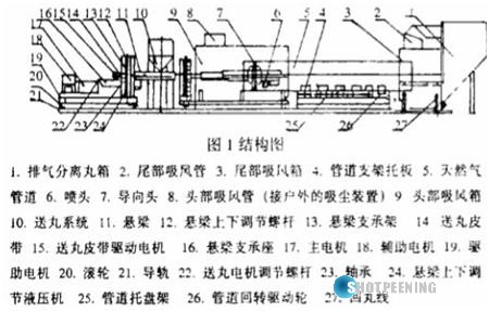 由于天然氣管道長度較長,采用常規的設備顯然不能滿足此件加工的要求,我們設計了噴九處理的專用設備-拋丸機,其結構簡圖如圖。
